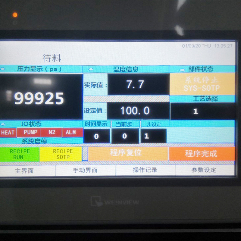 | Popis procesu provozu zařízení | Zařízení využívá programování průmyslového řízení PLC. Programovatelné ovládání zahrnuje stav spuštění/zastavení vakuové pumpy, nastavení úrovně vakua, dobu trvání vakua, dobu plnění inertním plynem, dobu uzavření elektromagnetického ventilu inertního plynu a zahájení/ukončení cyklu ohřevu. | ||