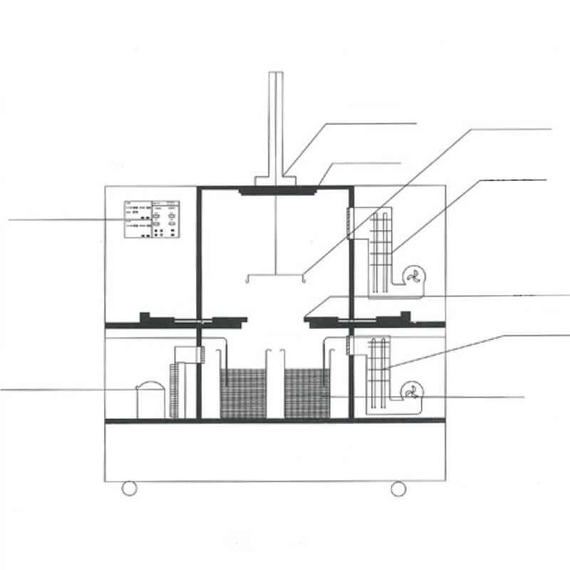 2.4. Vnitřní komora komory solné mlhy je vyrobena z nerezové oceli 316L. Vnější plášť využívá desky z uhlíkové oceli s povrchovou úpravou stříkáním. Nádrž na solný roztok je vyrobena z nerezové oceli 316L, s vnitřním i vnějším povrchem potaženým PTFE nebo vyrobenou z materiálu PTFE pro zajištění odolnosti proti korozi. Teplotní senzory využívají vysoce přesné platinové odporové senzory třídy A pro přímé měření teploty solného roztoku. Tyto senzory jsou plně zapouzdřeny v PTFE, aby se zabránilo reakci s roztokem soli. Vzhledem k požadavku na provozní teplotu 20 °C až 50 °C obsahuje komora pro ponoření soli dva systémy: cyklus chlazení a cyklus ohřevu. Cyklus ohřevu využívá stejnou metodu jako u sušících pecí.